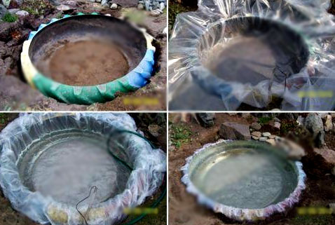 Еще одна малозатратная конструкция – это бассейн, вырытый в земле. Если в предыдущем случае в расход шли фанера, поддоны, металлические и гофрированные трубы, то здесь обойдемся только пленкой, синтетическими мешками, и камнями.