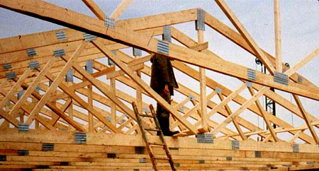 В массовом строительстве могут применяться элементы укрупнённой заводской сборки, представляющие собой щиты, состоящие из стропил, связанных брусковой обрешёткой с раскосами. Готовые щиты, похожие на фермы, укладывают с опорой на коньковый прогон и мауэрлат.