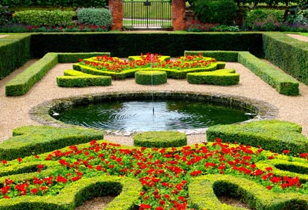 - Для украшения сада обустраивают геометрически правильные водоемы с фонтанами. Их контуры обкладываются керамикой или камнем. По ходу дорожек могут располагаться павильоны и порталы, на которых будут расти вьющиеся розы.