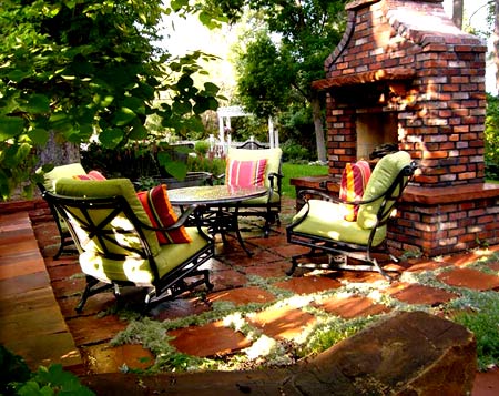 - Для дорожек и площадок используется плоский натуральный камень. Большая часть сада оставляется покрытой зеленой лужайкой.