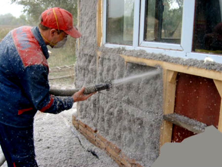 Если материал напыляемый, можно двигаться и в обратном порядке. Работа с пенополиуретаном показана на фото ниже.
