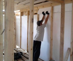- Со стороны помещения монтируется паронепроницаемая плёнка, которая располагается вплотную к утеплителю, под обшивочным слоем. Если утеплитель укладывается в несколько слоёв, пароизоляция может быть заложена между ними, но только в случае, если в этом месте температура будет превышать точку росы.