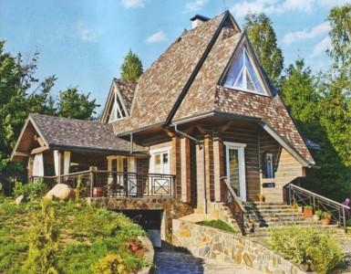 - Но главный признак стиля, конечно, высокая крыша, обязательно вальмовая или комбинированная, с множеством мезонинов и окнами на фронтонах (о домах с вальмовой крышей читайте в статье). Кровельный материал – в основном черепица, но может быть и солома.
