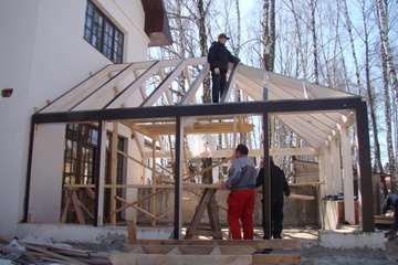 Крыши разной формы делают из калённого стекла, поликарбоната (толщиной 16–20 мм). Чтобы снег не скапливался на них, минимальный уклон крыши должен быть не менее 20⁰. Под зимний сад устанавливают ленточный фундамент.