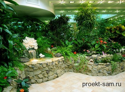 - Этническая стилистика. Наиболее интересны сады в японском стиле. Они приближены к пейзажным, только с характерными элементами японской этники: бонсаем, каменным садом, фонариками, дорожками из камня. Бамбуковый фонтанчик, ручеёк станет дополнительным украшением. Восточный зимний сад — это оазис буйно цветущих растений с фонтаном в центре и зоной отдыха. Предпочтение отдают «королеве цветов» — розе.