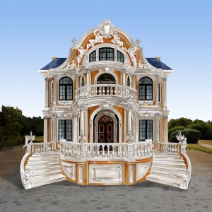 - На фасаде строения обязательно должна присутствовать объемная лепнина — она обрамляет оконные проемы, украшает центральные части композиции, дымоходы и т.п. Это и барельефы, и медальоны, и арки и даже мезонин.