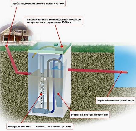 Эти микроорганизмы намного быстрее перерабатывают стоки, но им нужна постоянная подпитка кислородом, для чего в систему встроен аэратор, в который компрессором нагнетается воздух.