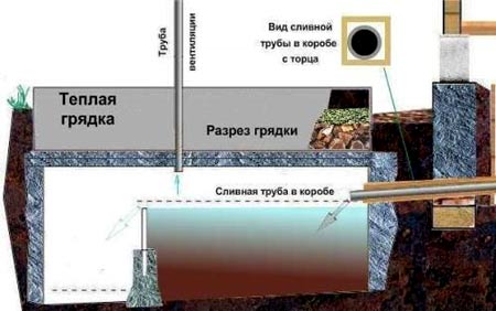 В корпус емкости встраивается сливная труба, загнутая внутри в направлении дна, чтобы поверхностная корка не мешала сливу. При наполнении вода перетекает в трубу и стекает дальше. В самых простых системах выход ведет в канавы.
