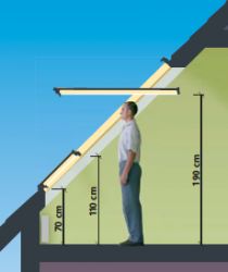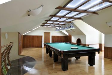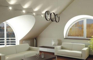 Освещение – это вообще больная тема для мансарды. В ней, конечно, можно сделать большое окно на фронтонной стене, и даже выход на балкон. Только делается это при строительстве дома, а перекраивать старые конструкции будет дорого. Поэтому, если не сделали окон заранее, ограничьтесь тем, что есть по факту, и делайте проект искусственного освещения.