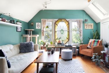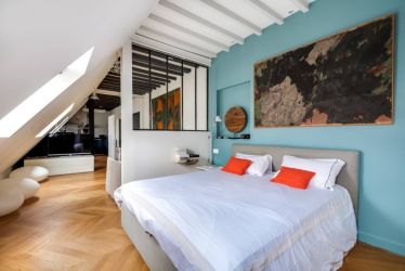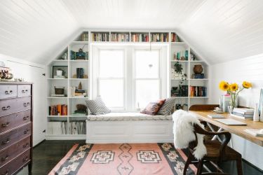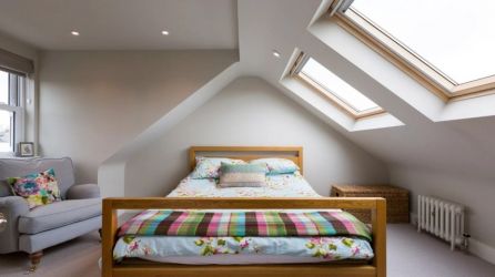 Именно поэтому самым распространённым решением при оформлении мансарды является вариант с белыми стенами и контрастными штрихами в виде деревянных балок, одной яркой стены или мягкой мебели с необычной расцветкой: