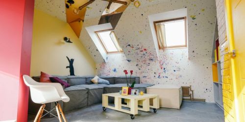 В мансарде можно использовать любые, чисто декоративные материалы: структурную штукатурку и художественные изображения, краски, обои с геометрическим или цветочным принтом, полоской, и даже лепнину, если того потребует стилистика интерьера. Вот о ней и поговорим далее.
