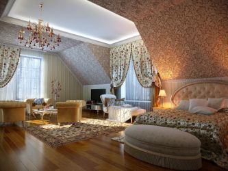 Мансарду, как и любое другое помещение, можно оформить в том или ином стиле, или же применить их сочетание. Но всё же, нетрадиционная конфигурация потолков, особенно сопровождающаяся их недостаточной высотой, накладывает определённые ограничения. Например, было бы смешно применять здесь дворцовые стили, наклеивая лепнину на фанеру или гипсокартон. Ведь королевские покои по логике вещей не могут находиться на чердаке и иметь потолки ломаной формы.