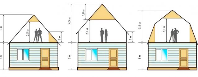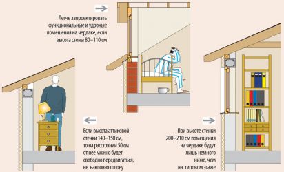 Мансардный дизайн зависит от конфигурации крыши (проекты мансардных крыш представлены в статье), её высоты в самой высокой точке, и наличия стенок (обычно их высота составляет 80-110 см). Наименьшее пространство получается под классической двухскатной крышей, свесы которой опираются на стены первого этажа, а аттиковых стен нет. Приходится создавать их видимость за счёт возведения каркасных перегородок в тех местах, что показаны на картинке.