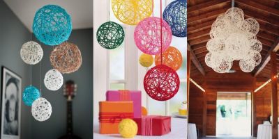 Шарик надувают так, чтобы он соответствовал размеру будущей игрушки. Нитки обильно смачивают клеем ПВА, наматывают в хаотичном порядке на шарик, подсушивают. Шарик прокалывают и вынимают пинцетом. Готовый плафон крепят к гирлянде.