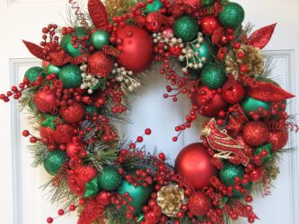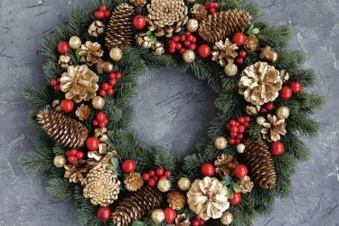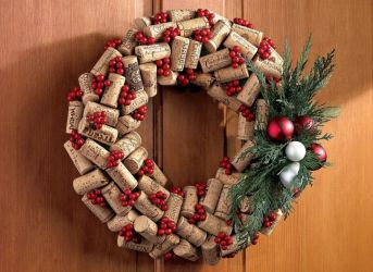 Сделать венок можно из мишуры, искусственных или натуральных еловых веток. Для украшения подойдут гирлянды, банты, ленты, ёлочные игрушки, шишки, гроздья ягод, искусственные снежинки.