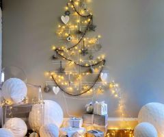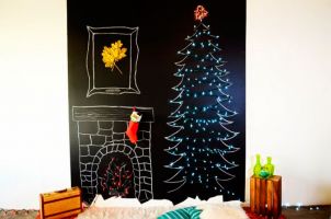 На стене можно выполнить праздничную надпись или изготовить плоскую ёлку из мишуры, сухих палочек, картона. Оригинально смотрится грифельная доска в виде елки с новогодними пожеланиями.