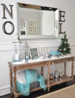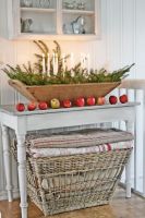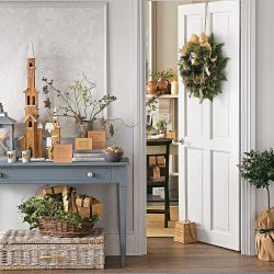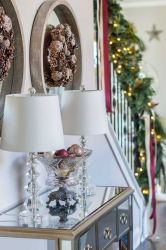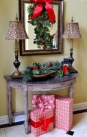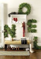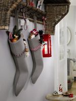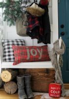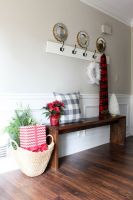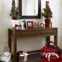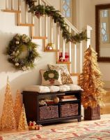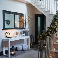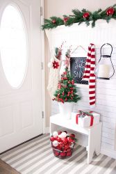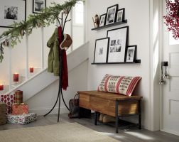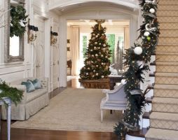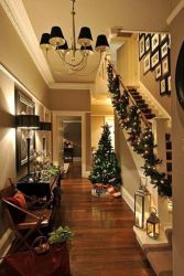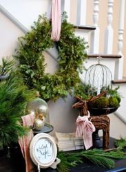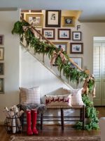 Часто хватает нескольких штрихов, чтобы лестница в прихожей стала нарядной. Повесьте на ограждение рождественские венки, гирлянду из фетровых игрушек, сапожки для подарков, поставьте на ступенях фонарики, вазоны с декором, просто разложите ёлочные шары.
