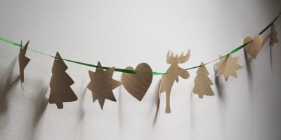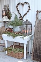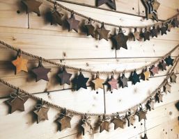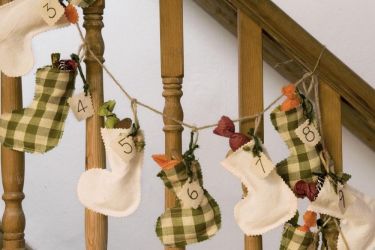Для интерьеров в деревенском стиле подходят украшения из натуральных материалов. Например, на перила можно повесить гирлянду из подручных материалов.