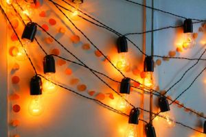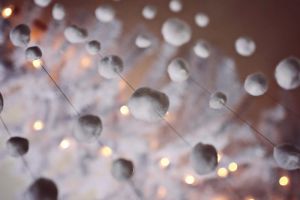 - Если лампочки мелкие, то гирлянду вешают под потолком. Получится эффект визуального увеличения комнаты за счёт освещения её верхней части. Если потолок высокий, то гирлянду дополняют подвесками из бумажных снежинок или ёлочных игрушек на атласных лентах.