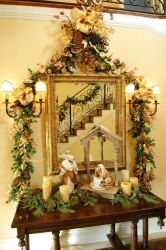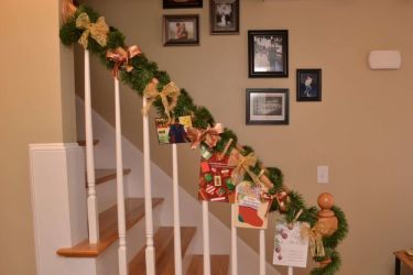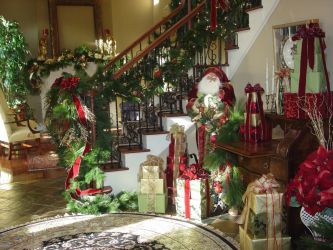 Для создания нарядного, величественного облика лестницы перила украшают пышными гирляндами, бантами, шарами и еловыми шишками. На них развешивают декоративные сапожки для подарков и фигурки ангелов.