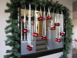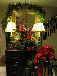 Раму зеркала украшают мишурой, светодиодной гирляндой или композицией из веток с лентами и шишками. Её закрепляют в верхней части зеркала или кладут на полку для головных уборов.