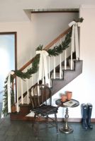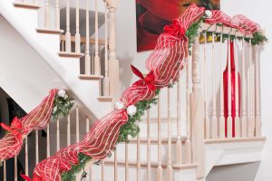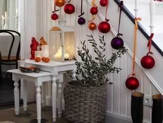 Перила украшают бантами, расцветка которых сочетается с убранством композиции на нижней площадке около лестницы. Здесь же можно установить высокую ёлку.