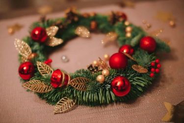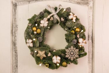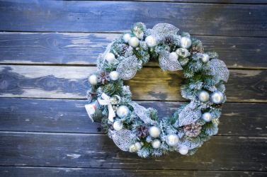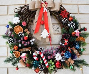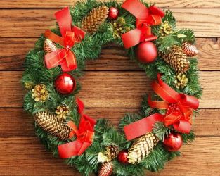 Рождественский венок – популярное украшение. Выглядит он ярко, может быть сделан из множества материалов, не занимает много места. Повесить его можно на свободную стену, окно или дверь. Если дверное полотно коричневое, то белые снежинки на нем будут неуместны, а вот венок из зеленых веток с красным бантом – в самый раз.