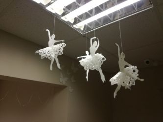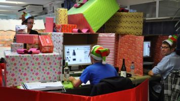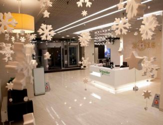 Если работа офиса связана с приёмом клиентов, то зал ожидания оформляют ёлками, гирляндами, снежинками на потолке и декоративными инсталляциями.