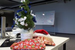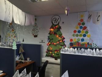 Оригинальное украшение офиса – тематическое видео на экране монитора и звезды-подвески на потолке.