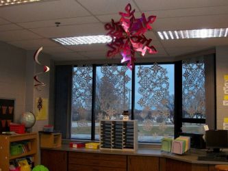 Если на стенах и дверцах мебели закрепить бумажные снежинки, интерьер сразу преобразится.