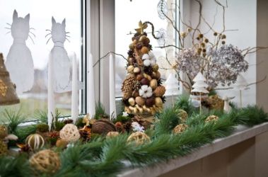 На подоконнике можно создать декоративную композицию из ёлочки с подарками.