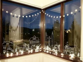 Расписать окно морозными узорами белой краской или зубной пастой.