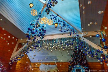 Эффектно выглядят световые колодцы на всю высоту здания, украшенные крупными свисающими гирляндами.
