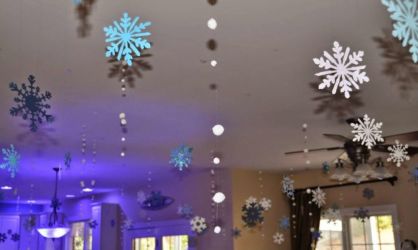 Холл можно превратить в настоящую зимнюю сказку, если творчески подойти к украшению стен и потолка.