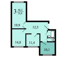 Однокомнатных квартир здесь нет. Площадь трёшек – 77 м2 (жилая 52 м2), восьмиметровая кухня. Балконы на третьем этаже и выше.