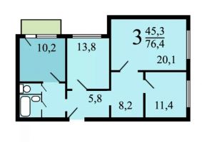 Площадь трёхкомнатной квартиры всего 57,8 м2, но все комнаты изолированные. Санузел раздельный. Балконов нет, зато есть пассажирский лифт.