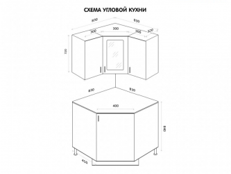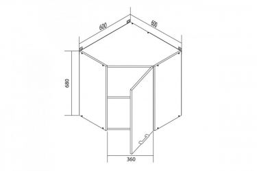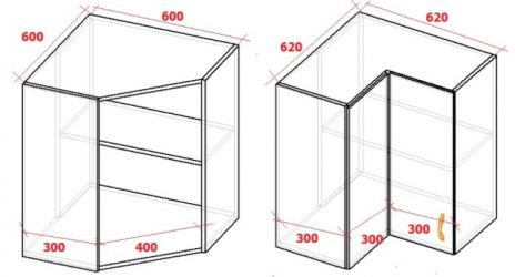 - Длина внутренних граней (расстояние от угла до края шкафа) зависит от формы изделия и его конструкционных особенностей. Если у шкафчика скошенная передняя стенка, ширина дверцы должна быть минимум 40 см (этот параметр напрямую зависит от размера задних стенок), иначе шкафом будет неудобно пользоваться.