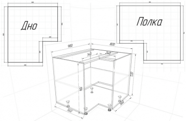 Нижний шкаф имеет аналогичное строение. Чтобы обеспечить нормальный доступ внутрь и сделать дверь минимальной ширины, длину задних стенок увеличивают до 90 см.