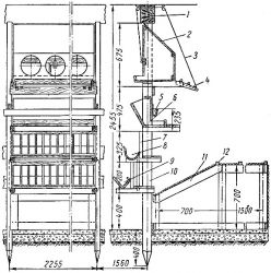 Пол гнезда имеет наклонную форму. По нему яйца скатываются и попадают на конвейер. Конечно, для домашнего курятника такие механизмы ни к чему, но, несколько упростив конструкцию, можно получить удобные гнезда. Вместо конвейера можно приспособить выдвижной лоток, который будет выходить в соседнее помещение. Это позволит не тревожить кур своим присутствием.