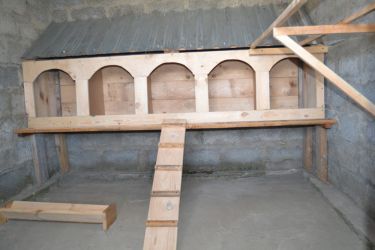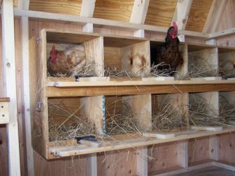 Верхнему ярусу гнезд необходимо сделать скатную крышу под углом 45 градусов, что не даст птице залетать на него и сидеть там. Гнезда необходимо установить до запуска кур в птичник, чтобы им не пришлось заново привыкать к помещению.