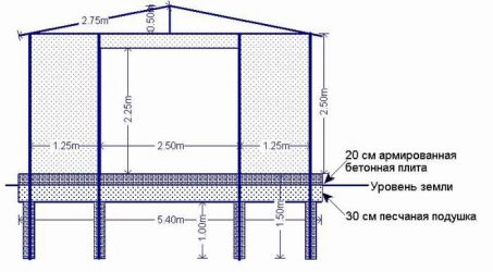 - Все столбы выводятся по высоте в один горизонтальный уровень, на них устанавливается нижняя обвязка каркаса в виде перекладин из трубы, которая подбирается по сечению так, чтобы справляться с нагрузками от всей конструкции в целом.