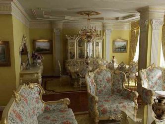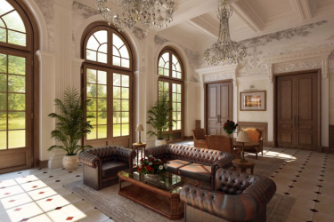В доме обязательно проектируется цокольный этаж, который обычно используют в качестве винного погреба. Цоколь высокий, ко входу ведёт широкий лестничный марш. Да и внутри дома предусматриваются монументальные лестницы в мраморе и красиво отделанном металле (чертежи лестниц смотрите по ссылке).