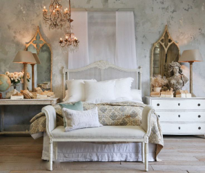 В любом направлении французского стиля огромное значение придаётся текстилю. Это и шторы, покрывала и скатерти, ковры, одеяла ручной работы, с помощью которых в комнате и создаётся уют. В спальнях, особенно оформляемых в стиле прованс, над кроватью часто есть балдахины из набивного ситца, настенные драпировки из ткани с мелким цветочным принтом, которой может быть обтянута и мягкая мебель.