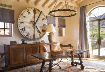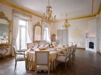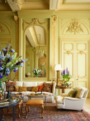 - Во французском доме, даже если он находится в деревне, всегда высокие потолки. Поэтому смело применяйте широкие потолочные карнизы, многоярусные люстры, высокие панели в классическом стиле (буазери), крупноформатные настенные аксессуары типа часов, зеркал, постеров и скульптур.
