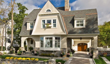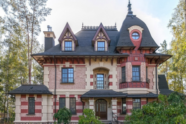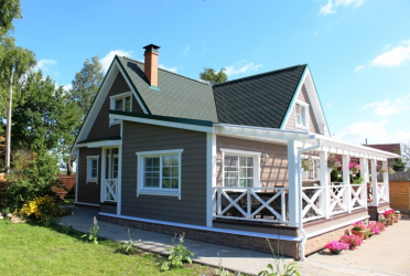 - Но главный признак стиля, конечно, высокая крыша, обязательно вальмовая или комбинированная, с множеством мезонинов и окнами на фронтонах (о домах с вальмовой крышей читайте в статье). Кровельный материал – в основном черепица, но может быть и солома.