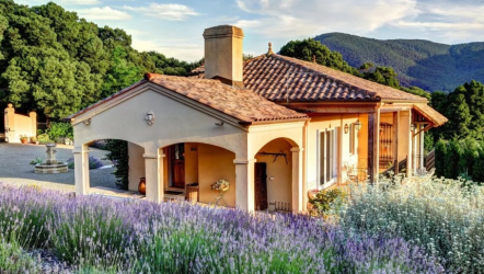 - Крыши в прованских домах могут быть как вальмовыми, так и двухскатными, многощипцовыми. Их особенность в обязательном наличии дормеров – выступающих за плоскость кровли слуховых окошек.