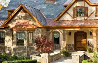 Палитра дома во французском стиле в Нормандии ближе к натуральным красно-коричневым гаммам, с добавлением серых, песочных, розовых оттенков.