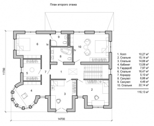 Этот дом в стиле шато больше предыдущего по площади, но также должен строиться по каркасной технологии. Общая площадь 212 м2 (95 м2 первый этаж, и 117 м2 второй), габариты в плане 11*13,2 м. Фундамент ленточный, с подвалом. Стены комбинированные: часть обшивается СИП-панелями, часть облицовывается кирпичом или камнем. Можно для отделки фасада использовать термопанели.