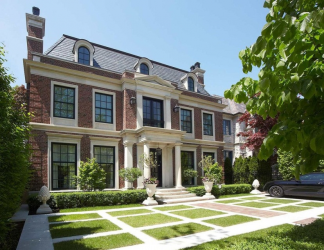 - Главный вход, или даже весь фасад, может быть отделан художественным способом, но тематика рисунка, обычно, растительная. Дверь на входе всегда массивная, но чаще остеклённая и с фрамугой.