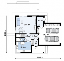Дом размерами 11,3*10,4 м с отапливаемой площадью 167,3 м2 рассчитан на одну семью. Площадь первого этажа 70 м2, второго 97 м2, разница отводится под встроенный гараж.
